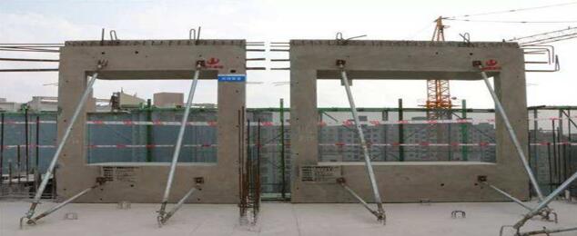 ?。?)墻板吊裝采用模數吊裝梁根據預制墻板的吊環位置采用合理的起吊點,用卸扣將鋼絲繩與外墻板的預留吊環連接,起吊至距地500mm,檢查構件外觀質量及吊環連接無誤后方可繼續起吊。