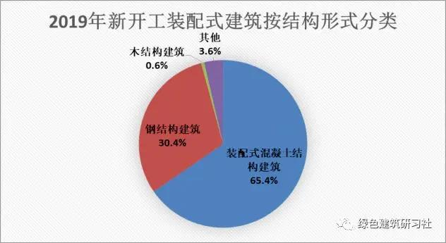 (三) 結構類型發展情況從結構形式看,依然以裝配式混凝土結構為主,在裝配式混凝土住宅建筑中以剪力墻結構形式為主。2019年,新開工裝配式混凝土結構建筑2.7億m²,占新開工裝配式建筑的比例為65.4%;鋼結構建筑1.3億m²,占新開工裝配式建筑的比例為30.4%;木結構建筑242萬m²,其他混合結構形式裝配式建筑1512萬平方米。