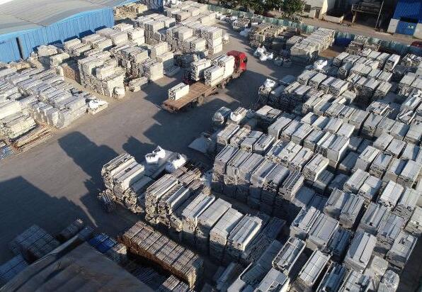 雙峰縣高新區,工人在操作叉車卸運建筑用鋁模板配件。乃繼輝 攝